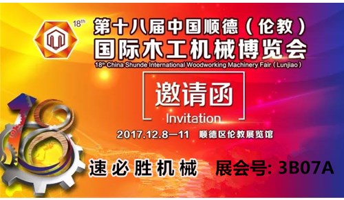 東莞速必勝機(jī)械將參展于:第十八屆中國順德(倫教)國際木工機(jī)械博覽會,誠邀您蒞臨參觀!